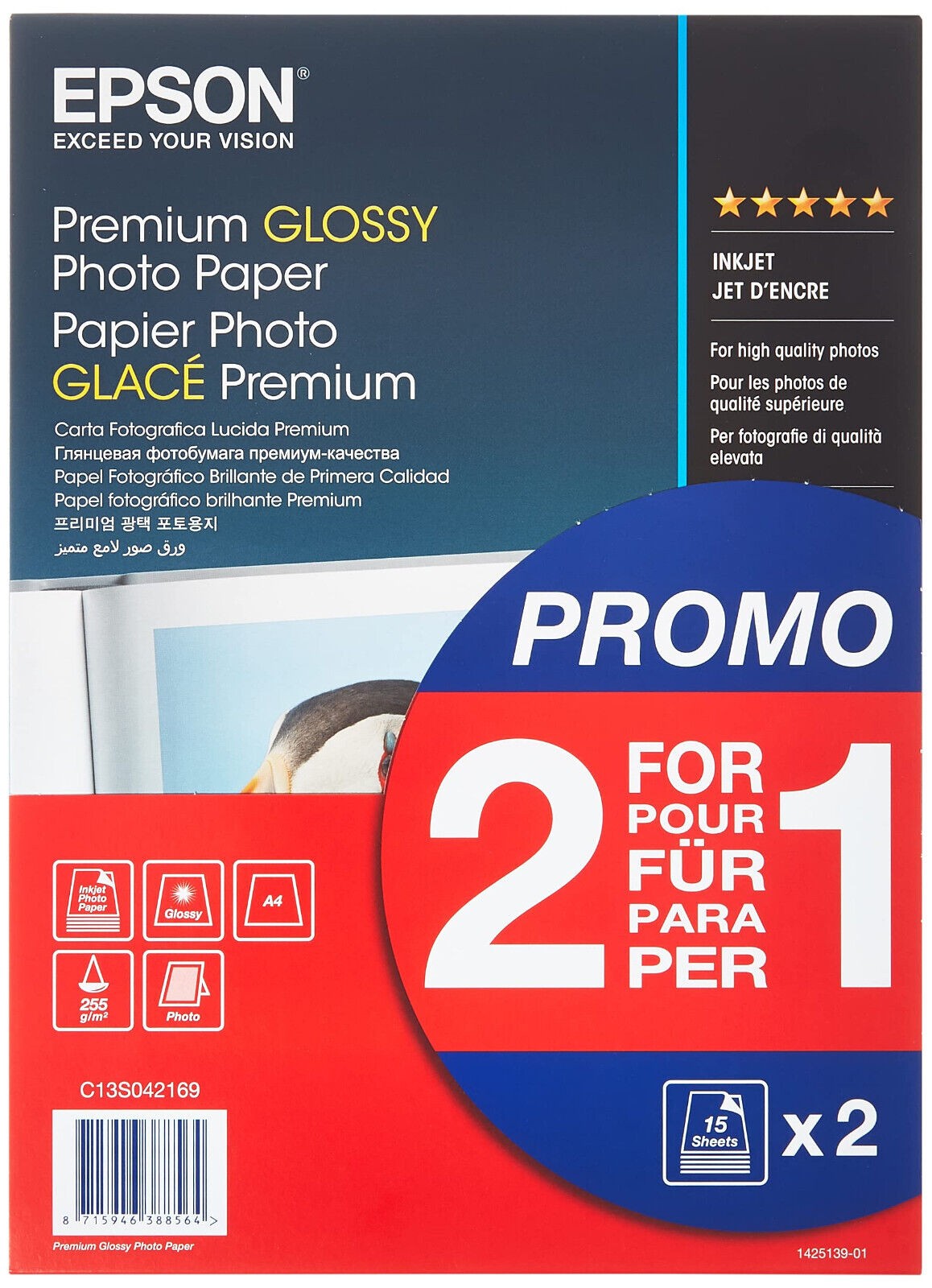 1 x Epson A4 (210x297mm) Premium Glossy Photo Paper, 255gsm, 30 sheets - (C13S042169), 2 packs for the price of 1.