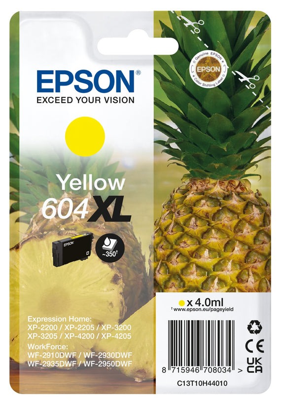Genuine Epson 604XL, Pineapple Yellow Ink Cartridge, T10H4, (Vacuum-Sealed)