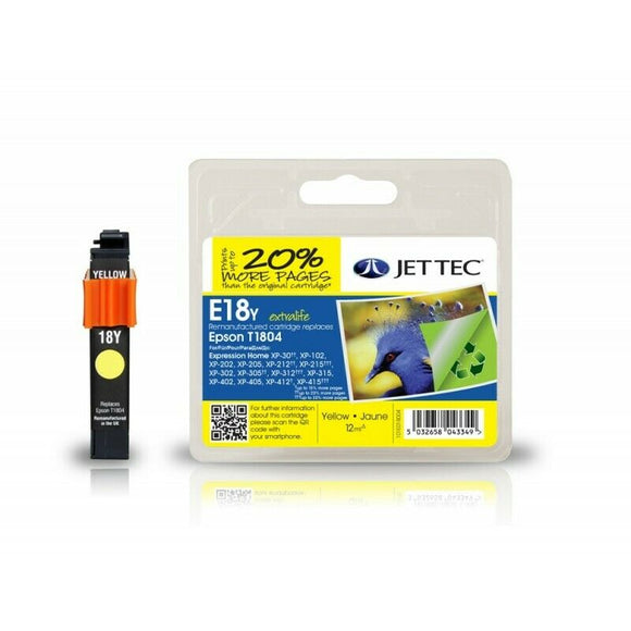 Jet tec E18Y Yellow Remanufactured Ink Cartridge, Replaces For Epson 18, T1804